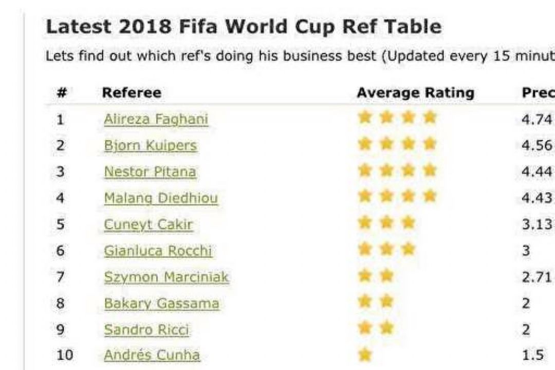 فغانی صدرنشین داوران جام جهانی علیرضا فغانی طبق نظرسنجی سایت رتبهبندی داوران فدراسیون جهانی فوتبال در صدر داوران جام جهانی قرار دارد. 7 سال پیش